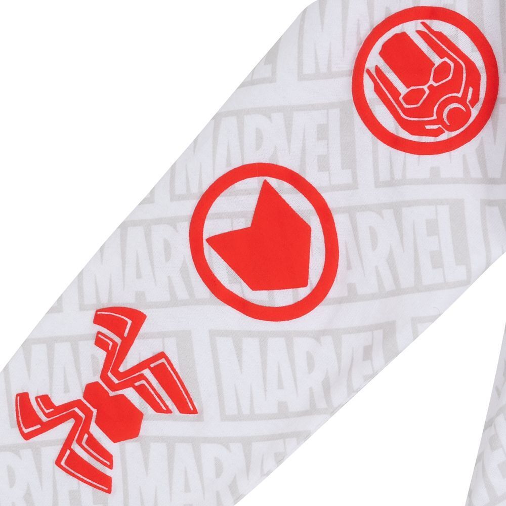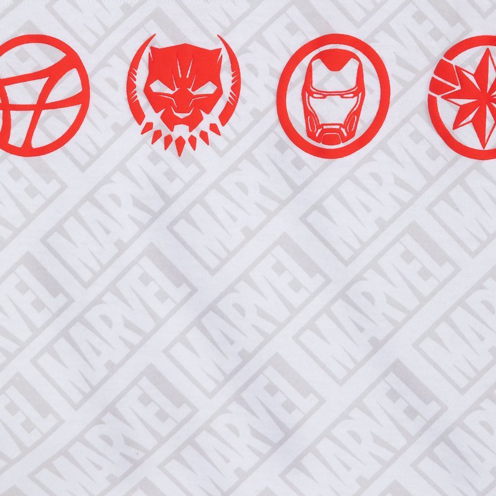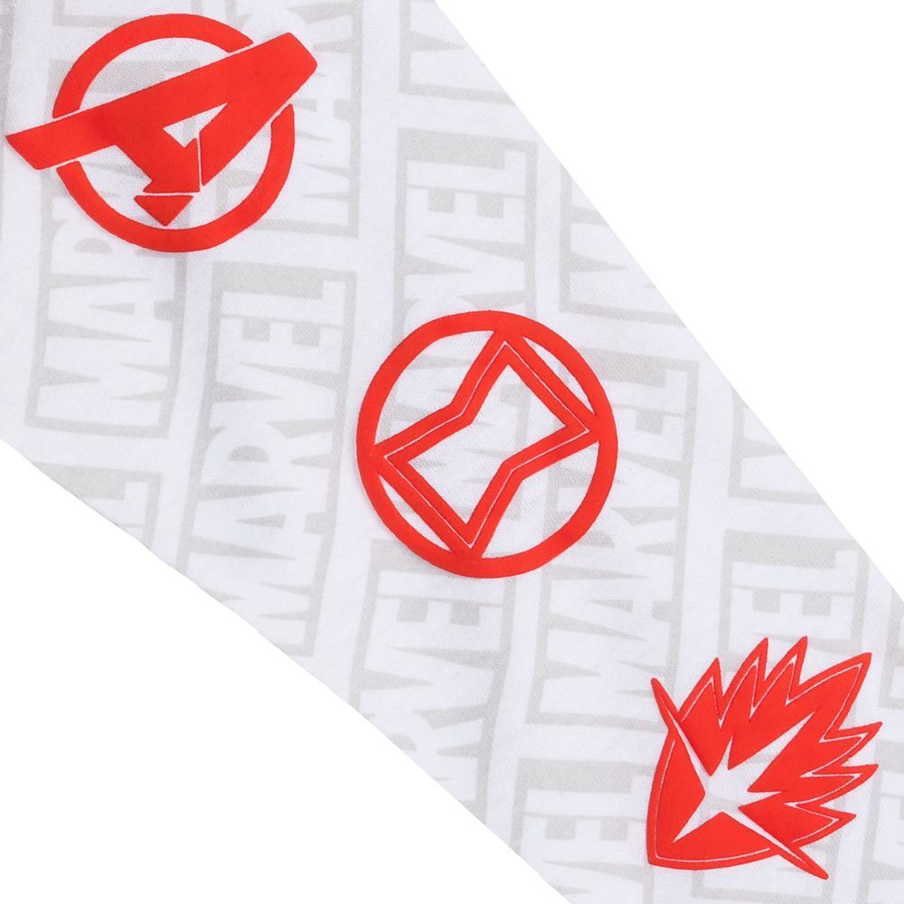 Puff ink Marvel logo and Avengers icons across back shoulder and sleeves