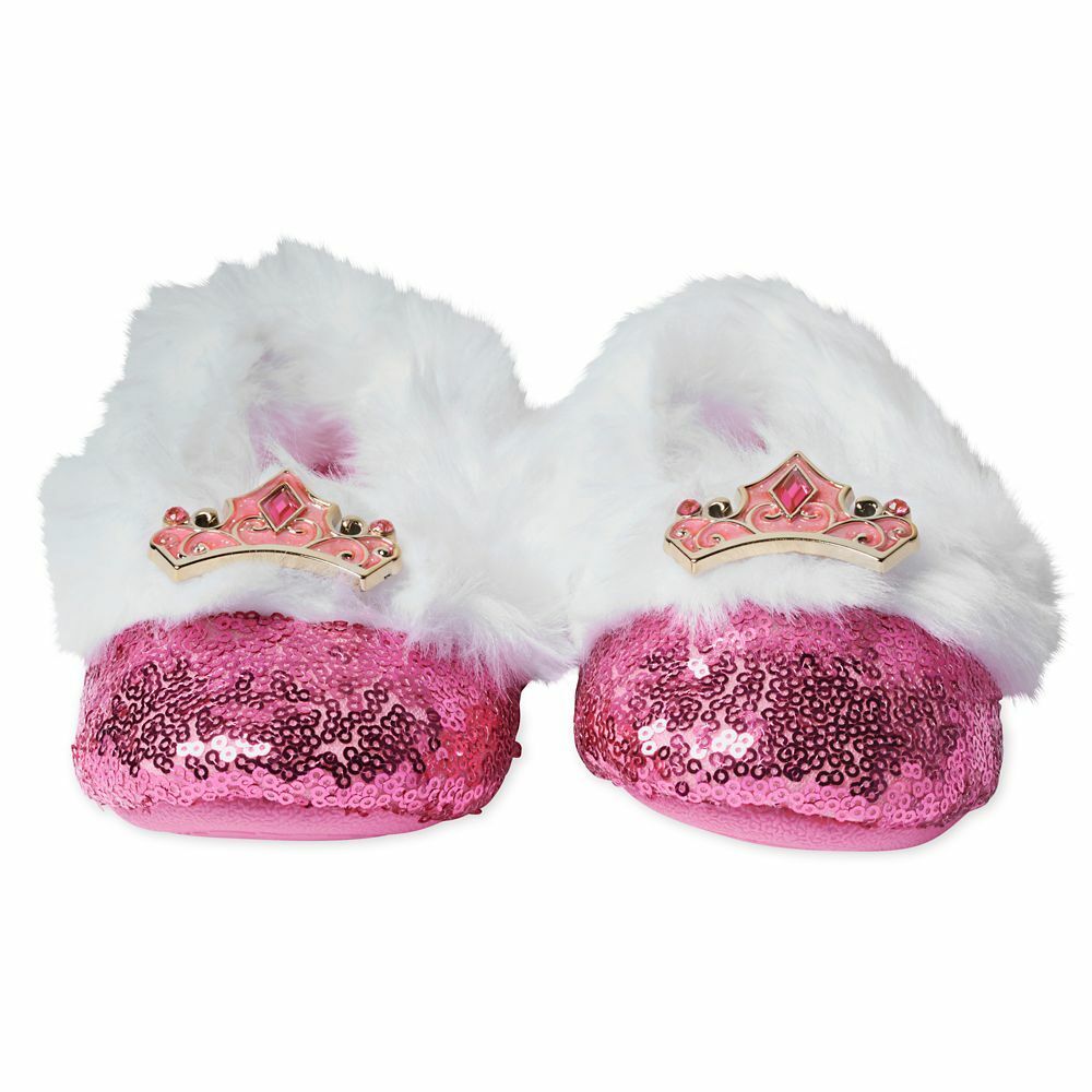 Your little one will have toasty toes while roaming the castle in these Disney Princess Slippers. Covered in dazzling pink sequins, and featuring a faux fur trim plus a royal tiara on the front, these super soft and snuggly plush slippers offer the comfort of thick padded soles.