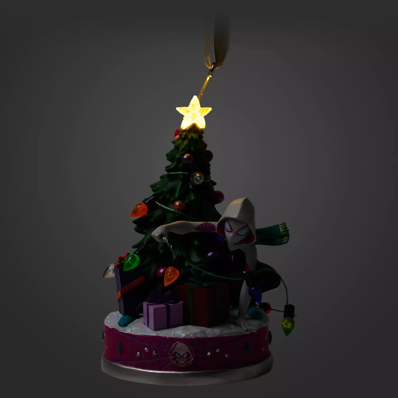 Ghost-Spider saves the holidays with her super-decorating skills. A Christmas tree with lighted star is the centerpiece for this sparkling Marvel Sketchbook ornament also featuring a string of colorful bulbs, iridescent glittering snow and a perfectly posed figure.