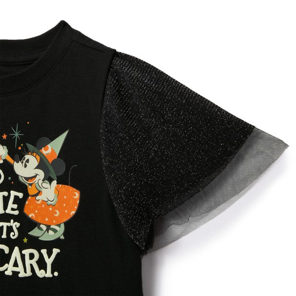 Embrace the Halloween spirit with this enchanting Minnie and Daisy fashion top, perfect for little ones who adore dressing up! Adorned with delightful graphics, this shirt showcases Minnie as a charming witch and Daisy as an adorable kitty, exemplifying the phrase ”so cute it’s scary.” The top is designed with sparkly mesh flutter sleeves that add a whimsical touch, while the puff print text enhances its festive appeal. Crafted as part of the exclusive Mickey Mouse Family Halloween Collection, this top is a seasonal favorite that will make any outfit a treat!