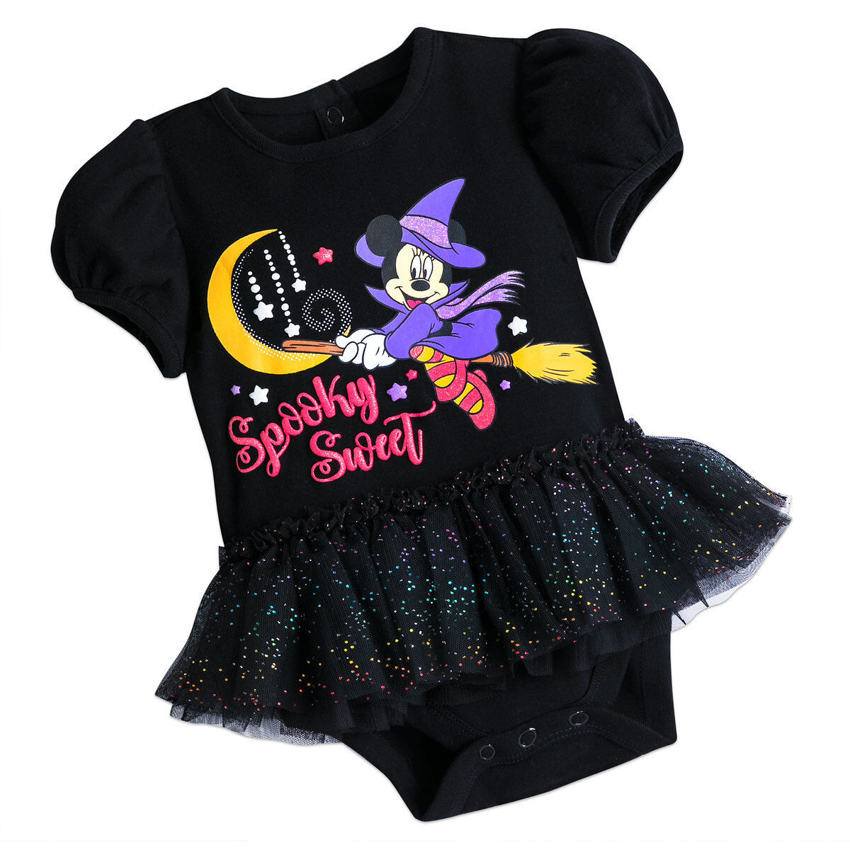 Your baby will be so ''Spooky Sweet'' in this Halloween bodysuit featuring Minnie Mouse. Dressed in a witch costume and riding a broom, Minnie is sure to help bring the smiles this Halloween.
