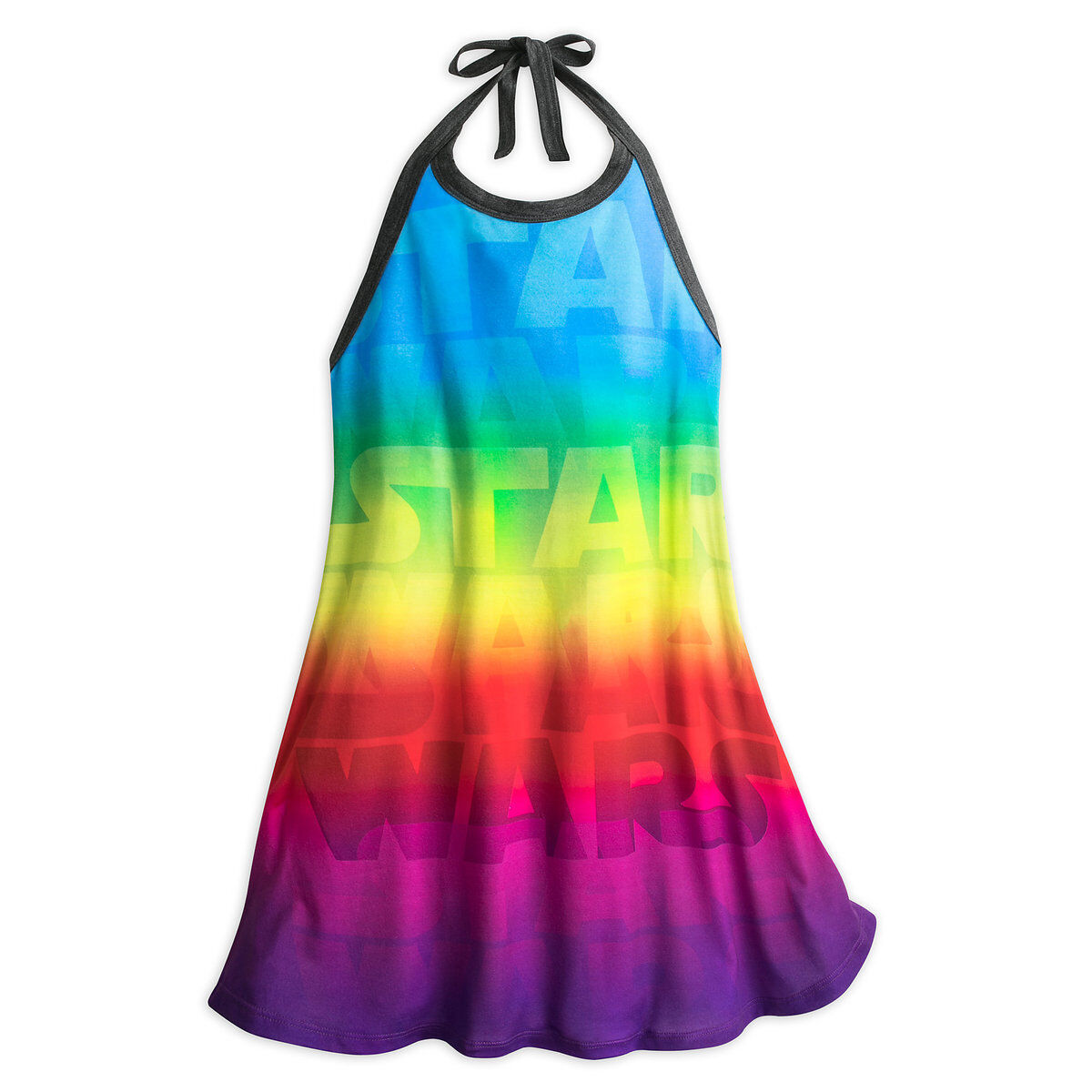 You'll always be chasing rainbows throughout the galaxy in this vibrant jersey knit dress displaying the Star Wars logo in a full spectrum of colors.